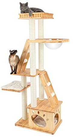 Cat Tree – Solid Wood Cat Tree, Multilevel Cat Tower with Scratching Posts, Climbing Ladder, Cat Condo and Hanging Toy