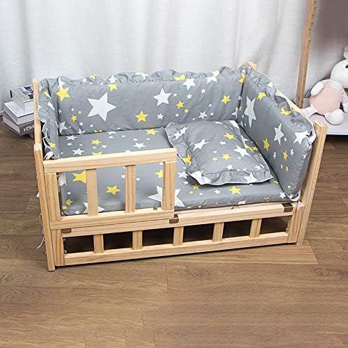 Dog Cat Bed Pet Bed, Wooden Dog Room Shelter with Guardrail, Indoor and Outdoor Use Washable Mattress Little Stars Pattern